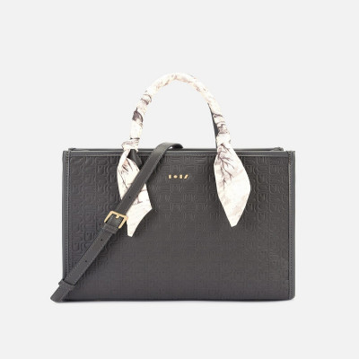 شنطه من الجلد المنقوش بأسم الماركه باللون الرمادي ، مرفق مع الشنطة شنطه صغيره بسحاب لحفظ أغراضك المهمه ، تتميز الشنطة بتصميمها الواسع المناسب لإطلالتك في الجامعه ولإطلالتك في العمل ، تتزين اليد المقوسه للشنطه بوشاح يضفي الأناقه لإطلالتك . شنطة بطول 30.5 سم وعرض 12 سم وارتفاع 24 سم، شنطه أنيقه بتفاصيل ملفته .