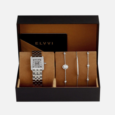 طقم هدايا نسائي من ماركة إلڤي مكون من ساعة وثلاث اساور باللون الفضي ، الساعة بسير من الستيل بلون فضي بتصميم مميز، ساعة بميناء بشكل مستطيل باللون الرمادي ، يتزين الميناء بالأرقام الرومانية و بإطار بارز مرصع بفصوص من الزركون البراق بتصميم متفرد، الاساور بتصميم راقي وناعم باللون الفضي يمكنك الاختيار بينهم او ارتدائهم معا ، ارتدي الطقم كامل لإطلاله مفعمه بالأناقه والرقي . ضمان سنة