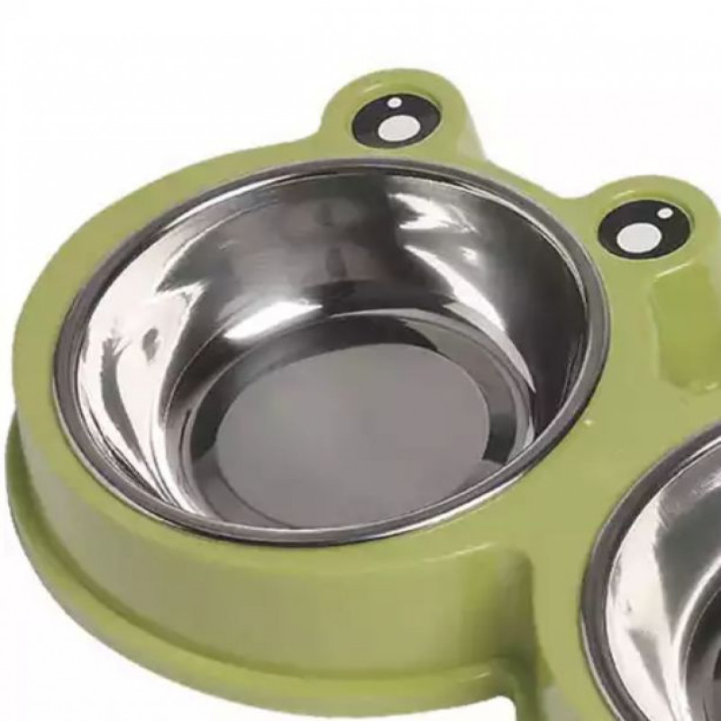 A single feeding bowl for your pet in a nice green color, designed in a safe and attractive way in the shape of a frog, made of plastic and containing an anti-slip coated stainless steel mold that does not leak, suitable for dry or wet food, easy to clean, multi-use and allows for long-term use Very lightweight and easy to carry around.