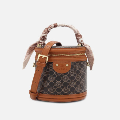 A women's bag from the Zyros bag collection, a bag made of soft leather embossed with the brand's logo in brown. The design of this bag is different from the usual. The bag is in a cylindrical geometric shape with elegant closing details. The bag is decorated with an elegant scarf that adds a feminine touch to your look. Attached to the bag is a belt whose length you can control. So that you can choose the right clothing for you and your look.