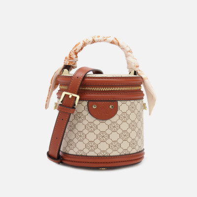 A women's bag from the Zyros bag collection, a soft leather bag embossed with the brand's logo in brown and beige. The design of this bag is different from the usual, a cylindrical geometric-shaped bag with elegant closing details. The bag is decorated with an elegant scarf that adds a feminine touch to your look. Attached to the bag is a belt that you can control. You will have the opportunity to choose the appropriate clothing collar for you and your look.