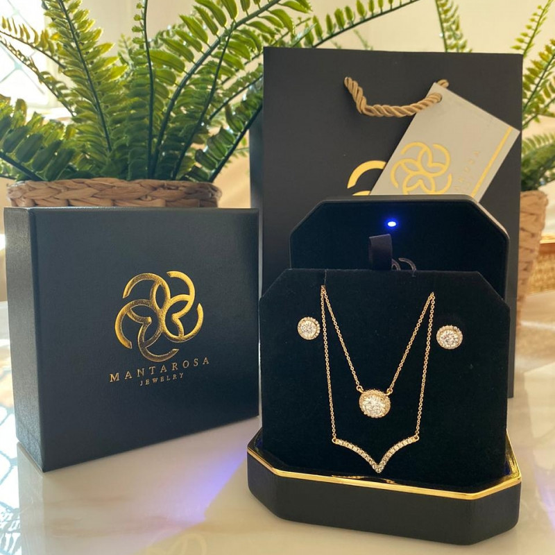 ◥ A necklace and earring with a distinctive modern design, studded with Austrian zirconium and plated with 21-karat gold, and the chain is also plated with gold. ️