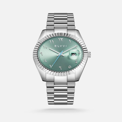 Men's watch from the Elvi brand with a silver stainless steel strap, a watch with a modern design. The watch features a green dial with Arabic numerals and a small window to display the date. A watch that suits all times for your morning and evening look to enjoy a sophisticated presence.