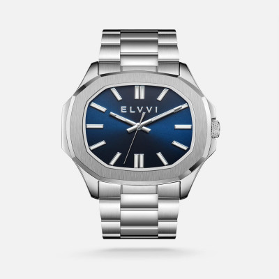 Men's watch from the Elvi brand with a silver stainless steel strap, a watch with a classic design. The watch features a wide blue dial. This watch will undoubtedly be the appropriate piece to wear at all times.