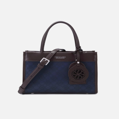 A brown and blue leather bag with details engraved with the brand's logo, measuring length = 23 cm - width = 9 cm - height = 16.5 cm. The bag features a curved handle and an attached wide belt so that you can wear the bag in the way that suits you. You can carry the bag in your hand for a classic look, and you can Carry it in a cross-body style for a modern look.