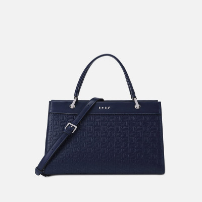 A leather bag with engraved details in blue, measuring length = 27 cm - width = 12 cm - height = 21 cm. The bag features a curved handle and an attached wide belt so that you can wear the bag in a way that suits you. You can carry the bag in your hand for a classic look, and you can carry it as a crossbody for a classic look. Modern.