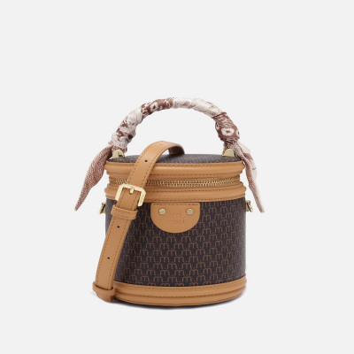 A brown embossed leather bag. The design of this bag is different from the usual. It is a cylindrical geometric shaped bag with zipper closure details to ensure the storage of your belongings. The bag measures length = 12 cm - width = 11 cm - height = 16 cm. Attached with the bag is a belt that you can control its length. So that you can choose the right clothing for you and your look.
