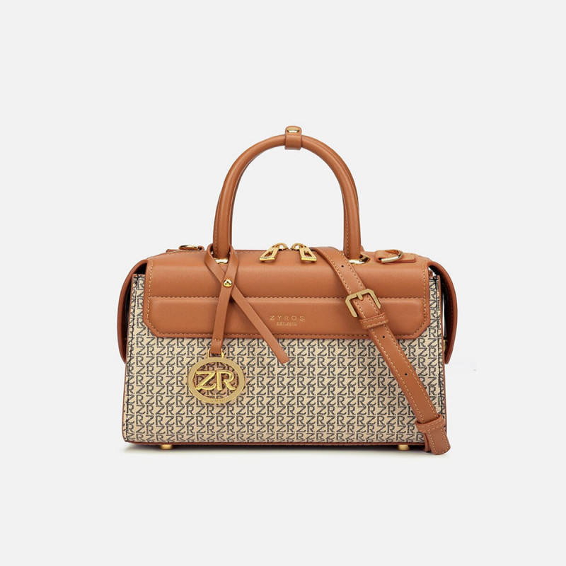 A women's bag from the Zyros brand, a bag made of leather embossed with the brand's letters in beige and soft leather in brown, a bag with a modern design for an everyday look. The bag is designed in a suitable size enough for all your daily needs with a curved top handle for easy carrying. The bag is accompanied by a long strap that you can wear on the shoulder or Cross-body style for a more unique look. Two years warranty from the date of receiving the product