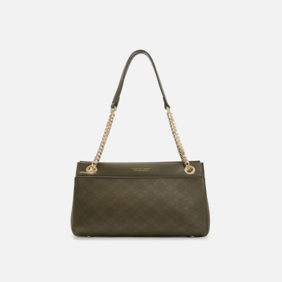 A leather bag embossed with the brand's logo in olive colour, a bag with a practical design for a practical look for every day. The bag is designed in a suitable size enough for all your daily needs with a curved top handle made of metal with a wide chain design and made of leather. The bag features a zipper closure and an internal division into two parts to arrange your belongings in an orderly manner and for easy access to them. Bag size: length = 26 cm - width = 10 cm - height = 19 cm. Coordinate the bag with your daily look.