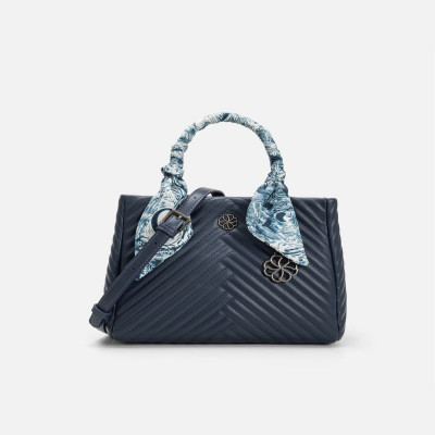 A women's handbag with a classic design from the elegant Zyros bag collection, a leather bag with geometric lines details in blue. The bag features a curved handle and an attached wide belt so that you can wear the bag in the way that suits you. You can carry the bag in your hand for a classic look, and you can carry it as a crossbody for a modern look.