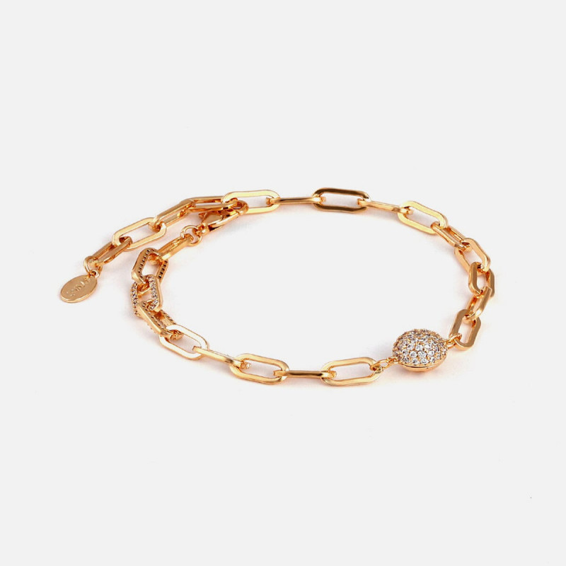 Women's bracelet from the Zyros brand, a bracelet with a unique design in gold with interconnected and overlapping links to give the shape of a bracelet. The bracelet features a circular charm in the middle studded with lobes of shiny zircon. Wear the bracelet with your look for an important occasion to add elegance to your look.