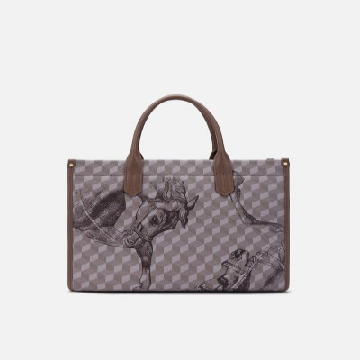 A women's handbag with a traditional and practical design in a square shape, a brown leather bag with a three-dimensional geometric design and prints of pictures of horses. Attached with the bag is a small bag with a zipper to store your important items. The bag is distinguished by its wide design suitable for your appearance at university and for your appearance at work. A bag with a height of 27 cm and a width of 15 cm. cm and 36.5 cm long, an elegant bag with striking details.