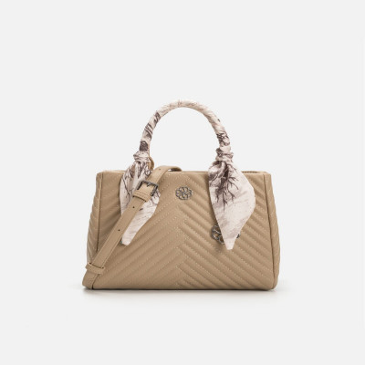 A women's handbag with a classic design from the elegant Zyros bag collection, a leather bag with geometric lines details in brown. The bag features a curved handle and an attached wide belt so that you can wear the bag in the way that suits you. You can carry the bag in your hand for a classic look, and you can carry it as a crossbody for a modern look.