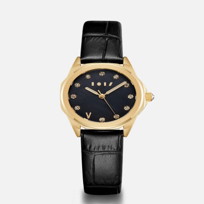 A women's watch from the Ann collection, a women's watch with a luxurious design to express you with a black leather strap. The watch features a black dial and a golden frame. The watch dial is decorated with the number 7 in Arabic and a number of zircon lobes that symbolize the place of the numbers to make your look unique at all times with simplicity and elegance.